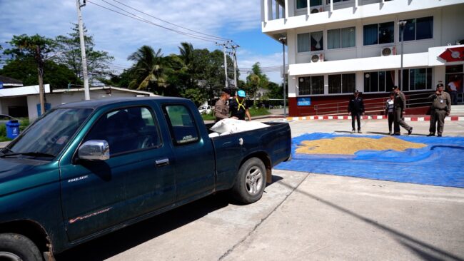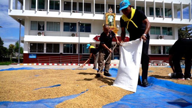 ซึ่งที่สถานีตำรวจภูธรบ้านฝาง อำเภอบ้านฝาง จังหวัดขอนแก่น ให้ชาวนานำข้าวเปลือกมาตากที่ลานจอดรถของสถานีตำรวจโดยมีเจ้าหน้าที่ตำรวจคอยช่วยเหลือยกข้าวจากรถ