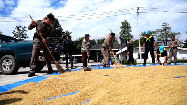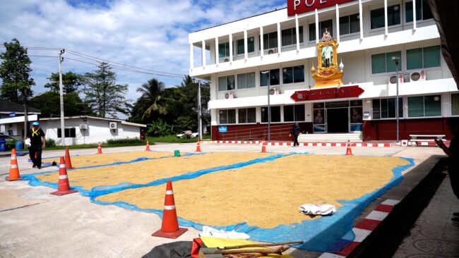 สถานีตำรวจภูธรบ้านฝาง จังหวัดขอนแก่น เปิดลานจอดรถให้ชาวนา นำข้าวเปลือกมาตากได้ โดยไม่ต้องกลัวข้าวหาย