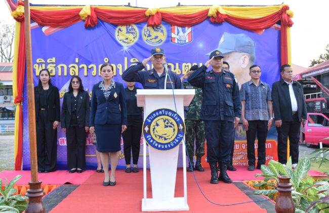 หนองบัวลำภู หนึ่งเดียวของประเทศไทย อำเภอศรีบุญเรือง จัดพิธีกล่าวคำปฏิญาณตนของสมาชิก ชรบ. (ชุดรักษาความปลอดภัยหมู่บ้าน) พร้อมอำลาตำแหน่งและส่งมอบธงประจำกองพัน ชรบ.อำเภอศรีบุญเรือง เพื่อแสดงความมุ่งมั่นในการทำงานเพื่อชุมชน