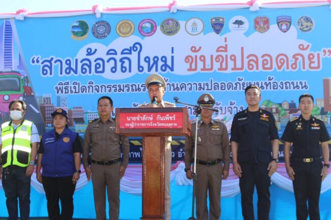 วันที่ 26 ธ.ค. 2568 ที่ บริเวณด่านพรมแดนสะพานมิตรภาพไทย-ลาว อ.เมืองหนองคาย นายจำลักษ์ กันเพ็ชร์ รองผู้ว่าราชการจังหวัดหนองคาย เป็นประธานเปิดปล่อยแถวจัดระเบียบรถสามล้อรับจ้างและการรณรงค์ความปลอดภัยทางถนนช่วงเทศกาลปีใหม่ โดยมี พ.ต.อ.จิรวิทย์ ปานยิ้ม ผกก.สภ.เมืองหนองคาย, พ.ต.ท.อดิศักดิ์ ทองหลาง รอง ผกก.ป.สภ.เมืองหนองคาย, พ.ต.ท.เกษม สมสิน สวป.(ชส.)สภ.เมืองหนองคาย, พ.ต.ท.อาทร อาจหาญ สว.จร.สภ.เมืองหนองคาย, พ.ต.ท.ไพบูลย์ จันธิราช สว.อก.สภ.เมืองหนองคาย พร้อมหน่วยงานที่เกี่ยวข้องและผู้ประกอบอาชีพสามล้อรับจ้างเข้าร่วม