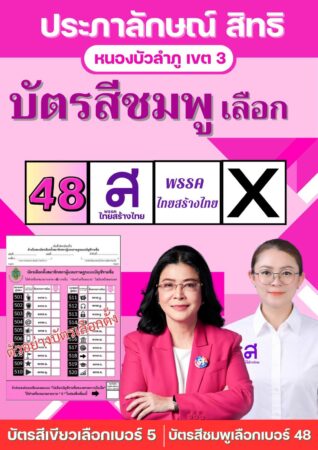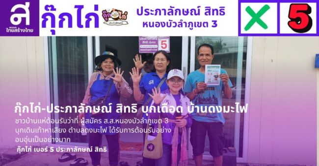ทุกครั้งที่ สจ.กุ๊กไก่ หรือ นางสาวประภาลักษ์ สิทธิ ผู้สมัคร ส.ส.พรรคไทยสร้างไทย เบอร์ 5 ผู้หญิงตัวเล็กคนนี้จะเดินเข้าหาแบบเคาะประตูบ้าน เดินตลาดแต่เช้าตรู่เพื่อแนะนำตัวขอโอกาสพี่น้องในเขตเลือกตั้งที่ 3 เทใจกำลังใจเลือก กุ๊กไก่ ลูกสาวหล่าคนนี้ จะได้เอาปัญหาความเดือดร้อนของพี่น้องประชาชนคนหนองบัวลำภู โดยเฉพาะเกษตรกรที่ปลูกอ้อยกันถึงร้อยละกว่า 60 นับวันมีแต่จะมอบมรดกการเป็นหนี้ให้กับลูกหลาน ซึ่งเชื่อแน่ว่าพรรคไทยสร้างไทย ที่คุณหญิงสุดารัตน์ เกยุราพันธ์ หรือ คุณหญิงหน่อย เป็นแม่ทัพและมีแคมแปญหรือนโยบายที่ดลใจพี่น้องประชาชนกันทั้งนั้น เลือกกุ๊กไก่ ไว้เป็นคนคอยรับใช้จะไม่ทำให้พ่อแม่พี่น้องผิดหวังแน่นอนค่ะ กุ๊กไก่ ผู้สมัคร ส.ส.เขต 3 เบอร์ 5 พรรคไทยสร้างไทย ขอการันตีจะขอทำหน้าที่แทนทุกท่านด้วยหัวใจที่มุ่งมั่นและทุ่มเท