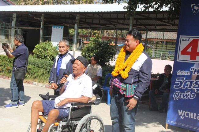 ขณะเดียวกัน ในการหาเสียงครั้งนี้ยังมีนายสมพงษ์ ปู่เพ็ง บิดาของผู้สมัคร ซึ่งเป็นอดีตสมาชิกองค์การบริหารส่วนจังหวัดขอนแก่นหลายสมัย และปัจจุบันเป็นผู้พิการ ต้องนั่งรถเข็นมาช่วยบุตรชายหาเสียง โดยนายสมพงษ์ได้กล่าวกับชาวบ้านที่มานั่งฟังการปราศรัยว่า “เชื่อมั่นในนโยบายต่าง ๆ ของพรรคภูมิใจไทย และหากบุตรชายได้รับเลือกเป็น สส. จะสามารถผลักดันนโยบายเหล่านั้นให้เกิดขึ้นได้จริง