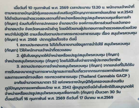 นพ.สสจ.หนองบัวลำภู กล่าวเพิ่มเติมว่า จากการดำเนินการกับบริษัทแห่งหนึ่ง ที่ได้มีการปลูกกัญชาที่ หมู่บ้านสวนสวรรค์ ต.วังทอง อ.นาวัง จ.หนองบัวลำภู หลัง การดำเนินการของบริษัทดังกล่าว ได้ส่งกลิ่นเหม็น ทำให้มีผลกระทบต่อชาวบ้าน เด็กนักเรียน มีอาการวิงเวียรศีรษะ อาเจียน บางคนเข้ารักษาตัวโรงพยาบาล ซึ่งหลังจากที่ ทางสำนักงานสาธารณสุขจังหวัดหนองบัวลำภู ได้รับทราบเรื่องนี้ ต่อมาเมื่อวันที่ 10 กุมภาพันธ์ 2569 ทางพนักงานเจ้าหน้าที่ ตาม พรบ.คุ้มครองและส่งเสริมภูมิปัญญาการแพทย์แผนไทย พ.ศ. 2542 ได้ดำเนินการเข้าตรวจสอบ สถานที่ดังกล่าว จนต่อมาเมื่อวันที่ 16 กุมภาพันธ์ 2569 ทางสำนักงานสาธารณสุขจังหวัดได้แจ้งคำสั่งพักใช้ใบอนุญาตให้จำหน่ายหรือแปรรูปสมุนไพรควบคุมเพื่อการค้า(กัญชา)