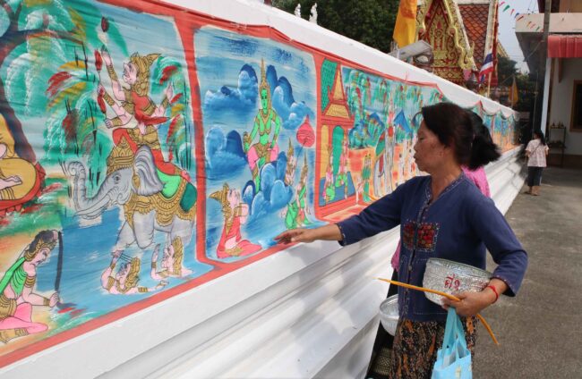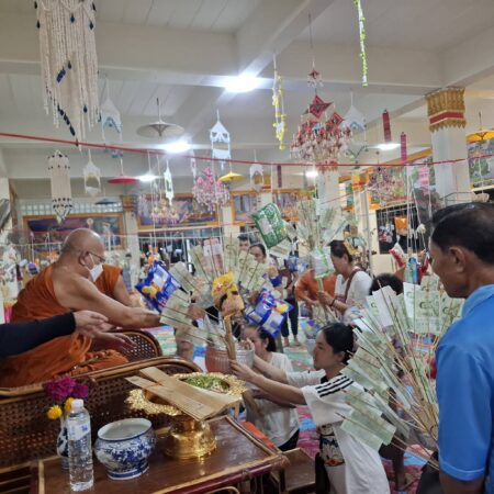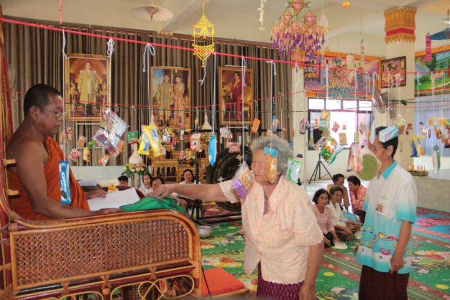 นางสวาท กล่าวอีกว่า นอกจากนี้พี่น้องประชาชนทุกครัวเรือนที่มาทำบุญ ก็จะมีการ “จกกัณฑ์” หรือจับสลากกัณฑ์เทศน์มหาชาติจำนวน 13 กัณฑ์ที่จัดเตรียมไว้ เพื่อเสี่ยงดวงหรือทำนายโชคชะตาราศีในรอบปีนี้ว่าจะเป็นอย่างไร จับสลากได้กัณฑ์ไหน ซึ่งพระพุทธองค์หรือองค์พระสัมมาสัมพุทธเจ้าได้ทรงทำนายไว้หรือเทศนาไว้ ทั้งนี้ เพื่อที่จะให้พุทธศาสนิกชนได้รำลึกนึกถึงแนวทางพระพุทธองค์ และจะได้ไม่ประมาทในการดำเนินชีวิต