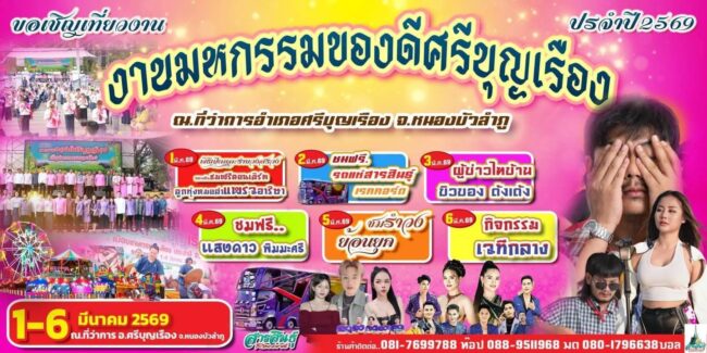 เมื่อเร็วๆนี้ นายธนายุทธ ใยแก้ว นายอำเภอศรีบุญเรือง เปิดเผยกับผู้สื่อข่าวว่าในระหว่างวันที่ 1- 6 มีนาคม 2569 ณ สนามหน้าที่ว่าการอำเภอศรีบุญเรือง จังหวัดหนองบัวลำภู เนื่องด้วยวันที่ 1 มีค.ทุกปี อำเภอศรีบุญเรืองได้รับการประกาศจัดตั้งเป็นอำเภอ(1 มีค.2512) และในวันที่ 1 มีค.69 อำเภอศรีบุญเรือง มีอายุครบรอบ 57 ปี จึงร่วมกับหน่วยงานภาครัฐและเอกชน จัดงานภายใต้แนวคิดชาว”ศรีบุญเรือง เราครอบครัวเดียวกัน” ในงาน”สักการะศาลหลักเมือง @ มหกรรมของดีศรีบุญเรือง เมืองเกษตรพอเพียง” ประจำปี 2569