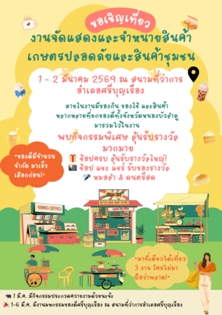 โดยภายในงานจัดให้มีการแสดงและจำหน่ายสินค้าเกษตรปลอดภัย และสินค้าชุมชน ผักปลอดภัย สดจากสวน ของกินอร่อย ๆ จากผู้ผลิตตัวจริง สินค้าพื้นบ้าน ของฝาก ของใช้ มากมาย พิเศษ ! ช้อปครบ ลุ้นรับของรางวัลใหญ่! จักรยาน และเครื่องใช้ไฟฟ้าอีกเพียบ ! ร่วมสนุกกับกิจกรรมช้อป แชะ แชร์ ลุ้นรับรางวัลแบบจุก ๆ สนุกไปกับการแสดงหมอลำ และวงดนตรีสด เที่ยวคุ้มยิ่งขึ้น โดยในวันที่ 1 มีค.69 พบการประกวดควายงาม และเที่ยวต่อกับมหกรรมของดีศรีบุญเรือง (1–6 มี.ค.) เที่ยวได้ทั้งครอบครัว กินอิ่ม ช้อปเพลิน สนุกทั้งวัน แล้วพบกัน