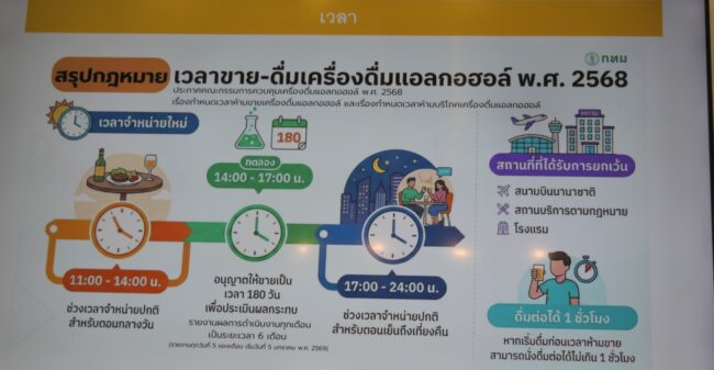 ในเรื่องของการเปลี่ยนแปลงในส่วนของกฎหมายฉบับใหม่ พระราชบัญญัติควบคุมเครื่องดื่มแอลกอฮอล์ ฉบับที่ 2 พ.ศ 2568 ซึ่งมีผลบังคับใช้ไปเมื่อวันที่ 8 พฤศจิกายน 2568 แม้ว่าจะมีกฎหมายลูกที่ออกอีกหลายฉบับ แต่กฎหมายที่บังคับใช้โดยไม่มีกฎหมายรองก็คือเรื่องการห้ามขายที่บุคคลที่ต่ำกว่า 20 ปี ซึ่งมีโทษปรับที่สูงถึง 100,000 บาท ซึ่งร้านค้าส่วนมากยังไม่รู้โดยเฉพาะร้านค้าในชุมชน วันนี้ก็ได้พูดถึงมาตรการที่จะหาวิธีการสื่อสารให้ร้านค้าในชุมชนมีการรับทราบกฎหมายและปฏิบัติตาม