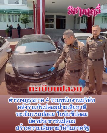 ตำรวจภูธรภาค 4 รวบพนักงานบริษัท หลังร่วมกันปลอมป้ายเสียภาษี ทะเบียนรถปลอม ใบขับขี่ปลอม และบัตรประชาชนปลอม สร้างความเสียหายให้กับภาครัฐ