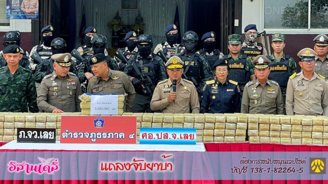 ผู้ว่าฯ เลย ร่วมกับ ผู้บัญชาการตำรวจภูธรภาค 4 แถลงข่าวจับกุมยาเสพติดรายสำคัญเกือบ 4 ล้านเม…