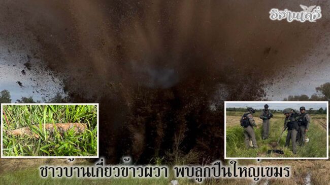 ชาวบ้านเกี่ยวข้าวผวา พบลูกปืนใหญ่เขมรยิงตกไม่แตกกลางนา รีบแจ้งหน่วย EOD เข้าตรวจสอบทำลาย เ…