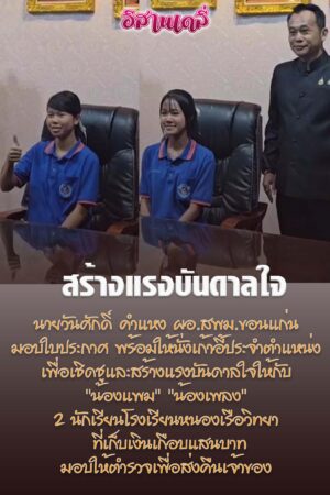 Read Moreขอนแก่น (ชมคลิป) ผอ.สพม.ขอนแก่น มอบใบประกาศ พร้อมให้นั่งเก้าอี้ประจำตำแหน่ง เพื่อเชิดชู และสร้างแรงบันดาลใจให้กับ “น้องแพม” “น้องเพลง” 2 นักเรียนโรงเรียนหนองเรือวิทยา เก็บเงินเกือบแสนคืนเจ้าของ